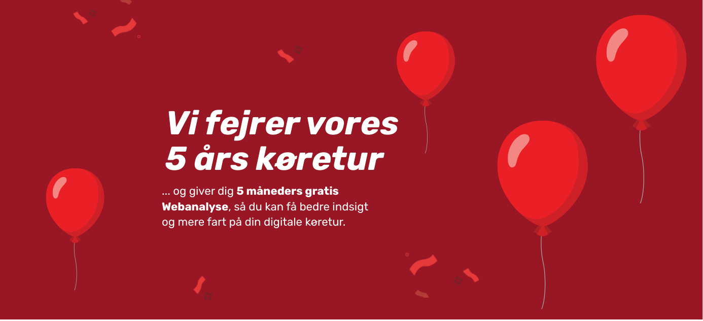 Vær med til at fejre vores 5 års køretur – og få gratis adgang til Webanalyse i 5 mdr. Læs mere her om, hvad Webanalyse