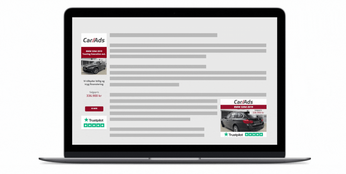 Display er bannerannoncer, som vises på tværs af eksterne hjemmesider, der samarbejder med Google om at vise annoncer. Her handler det mere om at inspirere og øge dit kendskab, end det handler om at skabe decideret salg. Du fanger typisk ikke købeklare kunder med display, men det er heller ikke målet. Bannerannoncer fungerer rigtig godt til at holde dit bilhus top of mind, så kunderne husker dig, når de senere er klar til at købe. Bannerannoncer har derfor typisk heller ikke en særlig høj konverteringsrate.