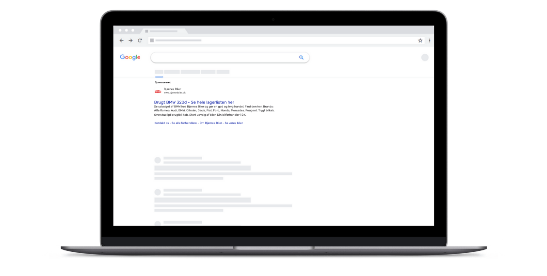 Search er tekstbaserede annoncer, der vises direkte i søgeresultaterne, når brugeren leder efter en bestemt bil eller forhandler. Tekstannoncer er ofte særligt effektive, fordi intentionen hos brugeren er høj. Søger en bruger på Brugte VW Passat Odense, er de typisk ret langt i købsrejsen og ofte tæt på at ville handle. Search har derfor også ofte en langt højere klik- og konverteringsrate end f.eks. display.